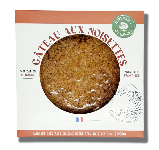 Ce gâteau aux noisettes est préparé avec amour, avec des noisettes issues de nos producteurs partenaires situés en Lot-et-Garonne et notre farine de noisette.